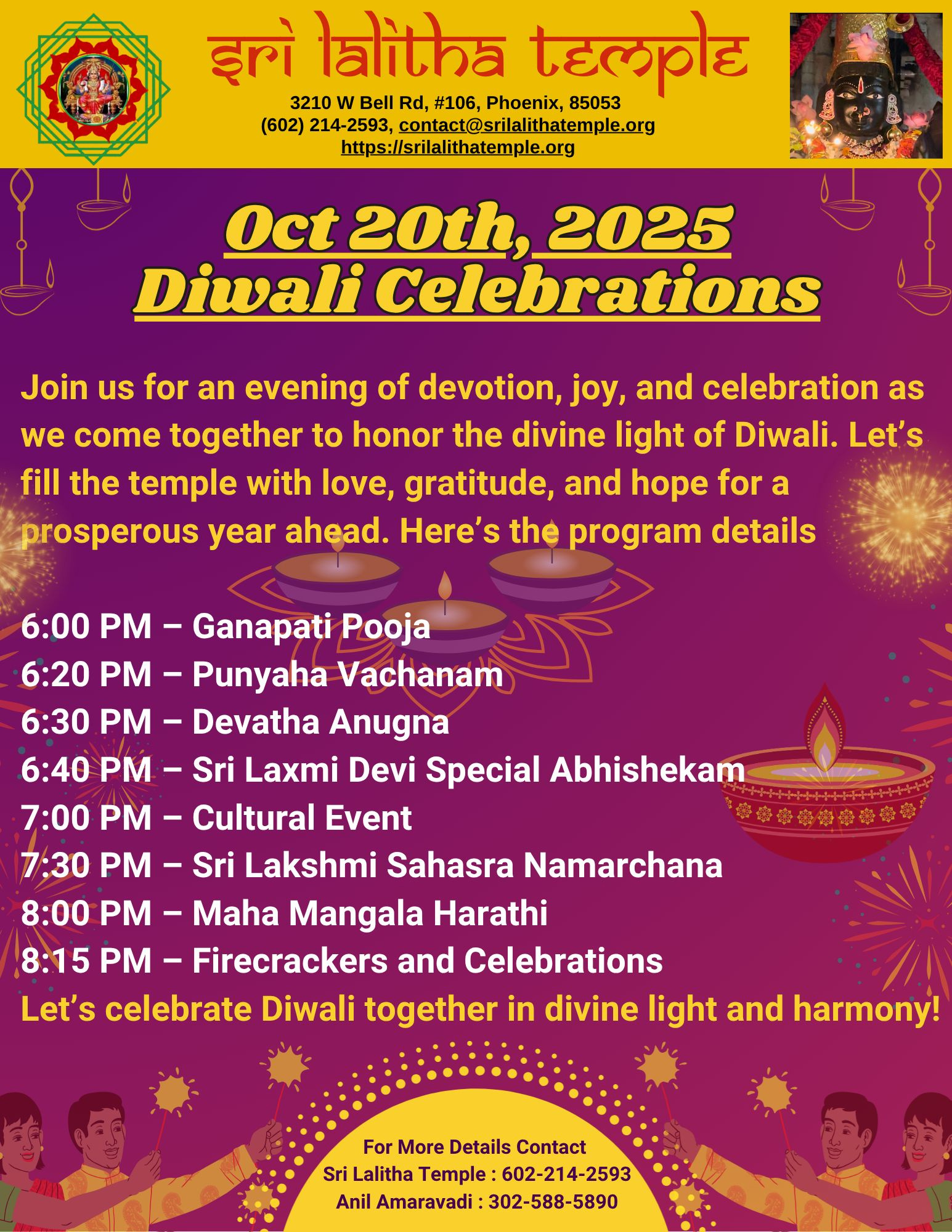 Join us for an evening of devotion, joy, and celebration as we come together to honor the divine light of Diwali.