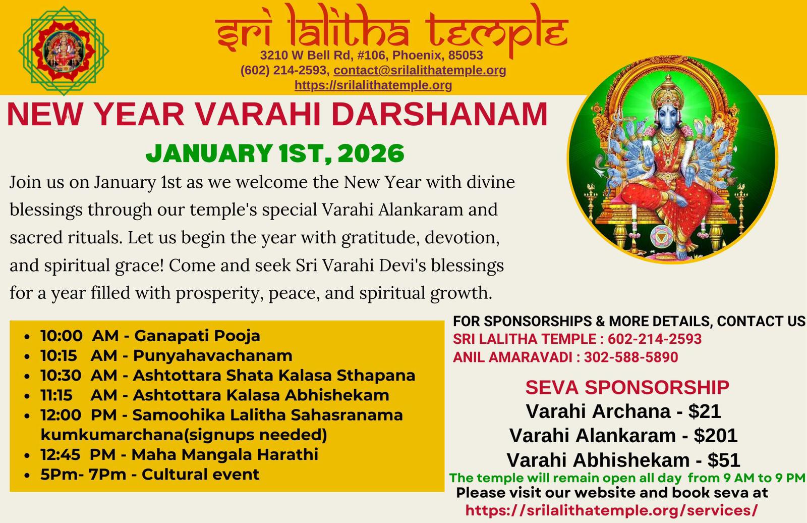 New Year Varahi Darshanam New Year Varahi Darshanam 1570 1570 people viewed this event. Register for event To register for this event email your details to akshar.horusindia@gmail.com Register using webmail: Gmail / AOL / Yahoo / Outlook Date And Time January 1, 2026 to January 2, 2026 Location Temple Event Types Festivals Event Category Festivals Share With Friends Facebook Twitter Linkedin Xing Pinterest