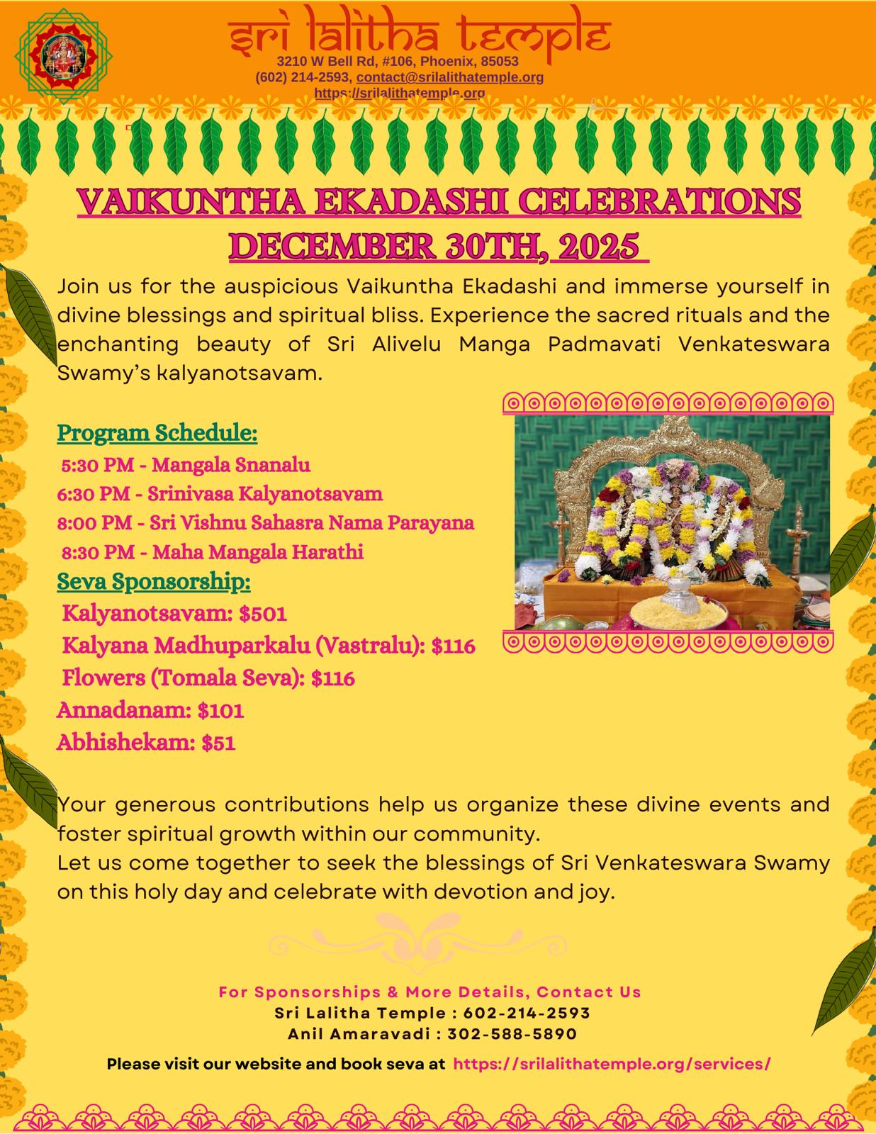 Vaikuntha Ekadashi Celebrations Vaikuntha Ekadashi Celebrations 1602 1602 people viewed this event. Register for event To register for this event email your details to akshar.horusindia@gmail.com Register using webmail: Gmail / AOL / Yahoo / Outlook Date And Time December 30, 2025 to December 31, 2025 Location Temple Event Types Festivals Event Category Festivals Share With Friends Facebook Twitter Linkedin Xing Pinterest
